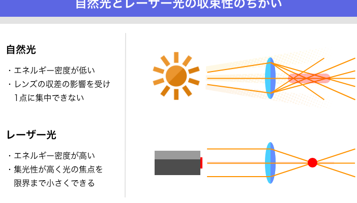 - 集束性:雷射光は、非常に細いビームに収束します。これにより、特定の対象に対して高いエネルギー密度を提供できます。