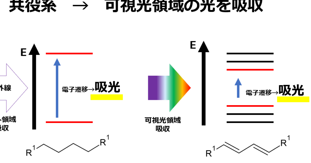 - 分子が光を吸収すると、電子が高エネルギー状態に移動します。