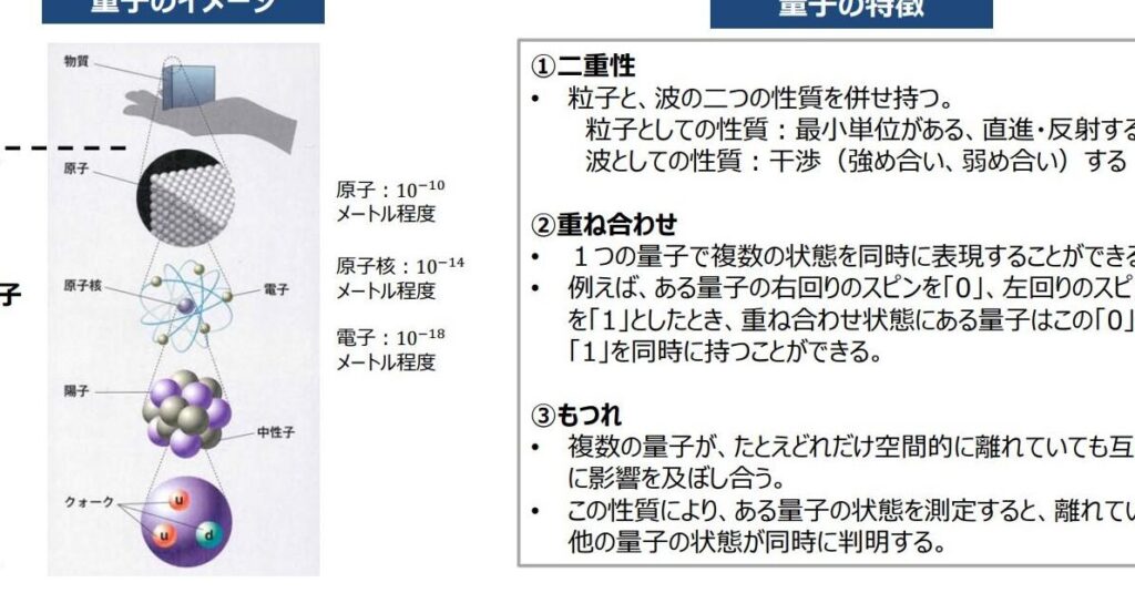- 重ね合わせ: 量子は同時に複数の状態に存在できるため、観測するまで定まった状態がありません。