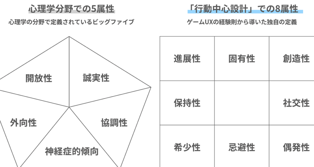 私たちの行動は、様々な特性から大きな影響を受けます。特性に基づく行動の変化は以下のようになります。
