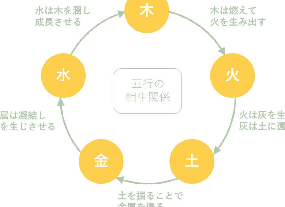 相生の法則は、五行が互いに助け合い、育つ関係を示します。具体的には、以下の要素によって形成されています。