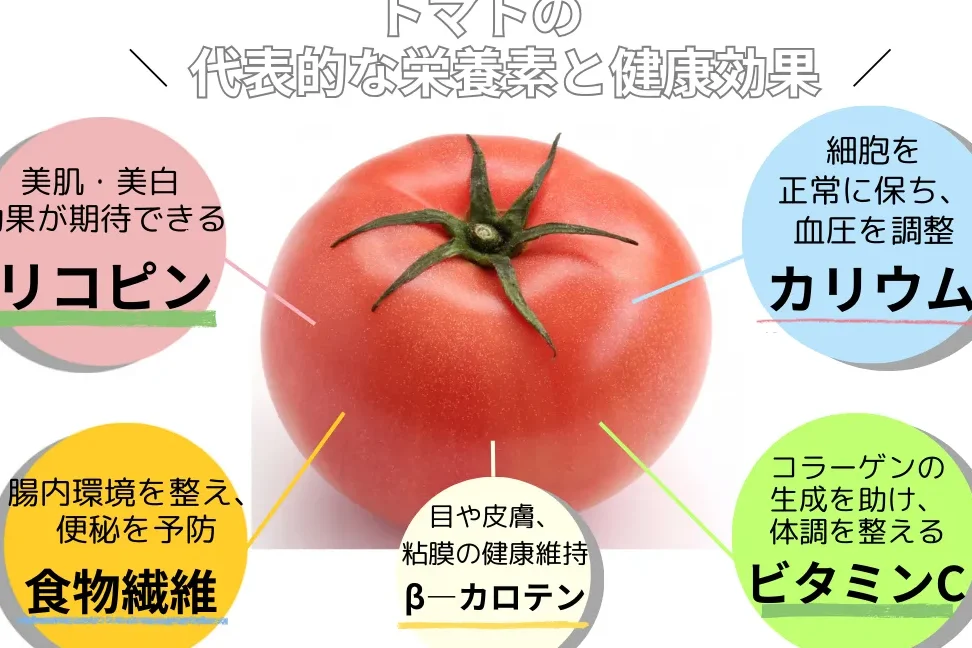 トマトには多くのビタミンとミネラルが含まれています。特に以下の成分が重要です。