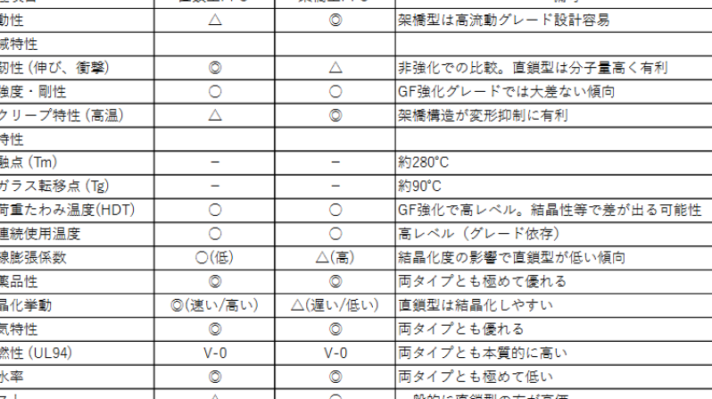- 機械的強度:PPS特性は耐熱性や耐薬品性が特徴で、他の材料が持つ単なる機械的強度とは異なる。