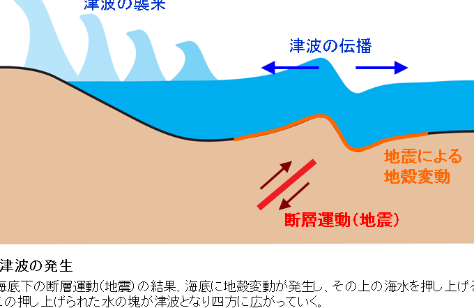 地震は津波の最も一般的な原因である。特に、海底で発生する大規模な地震が津波を引き起こす。震源が海底に位置する場合、断層の動きが海水を急激に押し上げ、波が形成される。この波は、次の特徴を持つ。