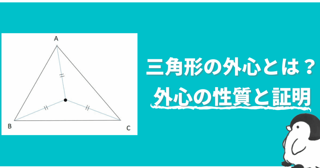 - 全ての頂点から等距離にある。 これは外心の定義でもあり、三角形の外接円の中心です。
