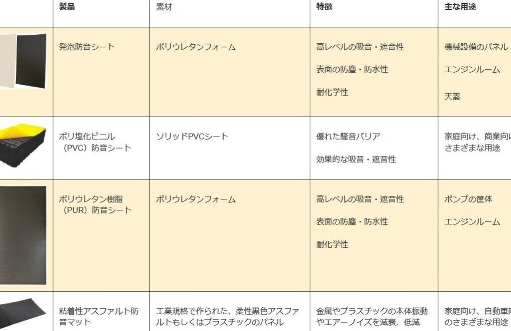 遮音材は、音の伝達を防ぐための素材である。外部からの騒音を遮断する役割を持ち、以下のような素材が一般的に使われる。