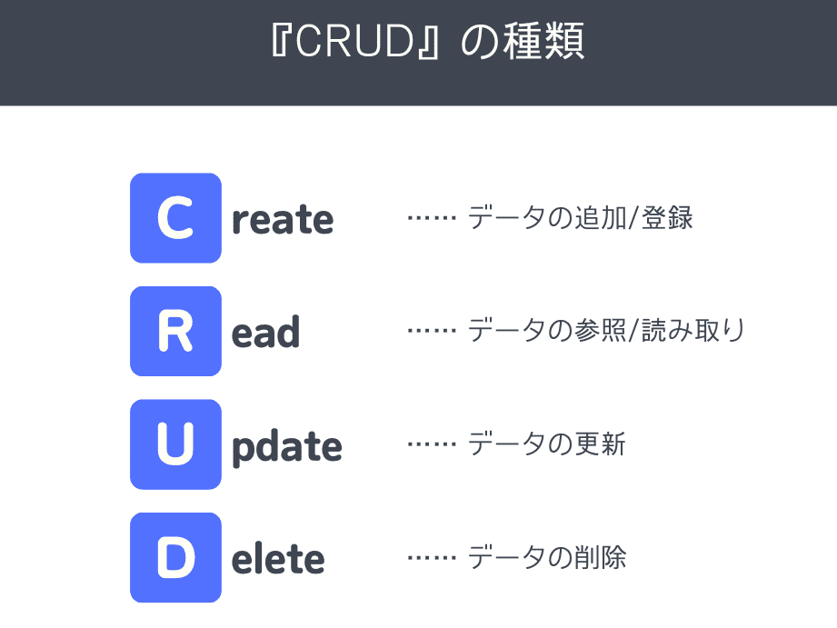 | 読み取り (Read) | 既存データを取得し表示する。 | ユーザー決定や分析の基礎となる。 |