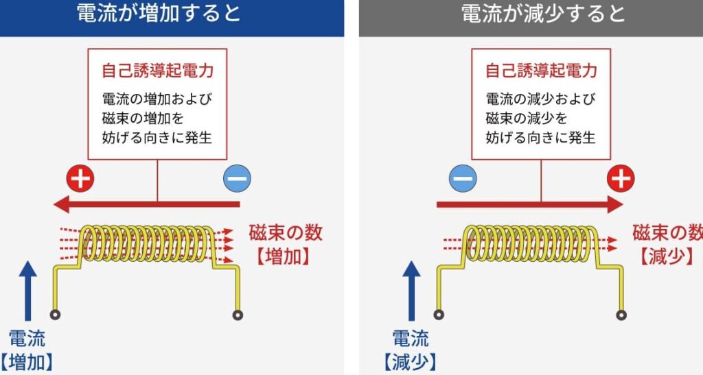 - 自己誘導: コイル内で発生した電流が時間とともに変化するときに、自ら生成する電圧。