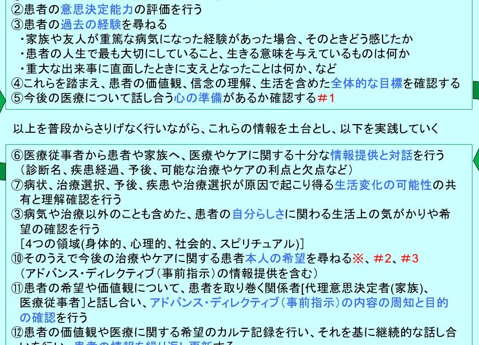 - サポートシステムとの関係: 社会的支援ネットワーク(家族や友人)との関係も重要であり、これによって情緒的安定感や自己効力感が向上し、それぞれの患者に合った適切な判断へと繋がります。