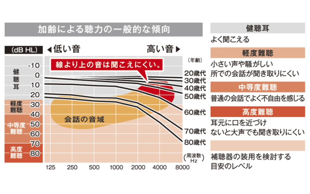- 中音域: 1000Hzから4000Hz間で、人間の声などの日常生活でよく聞かれる周波数です。