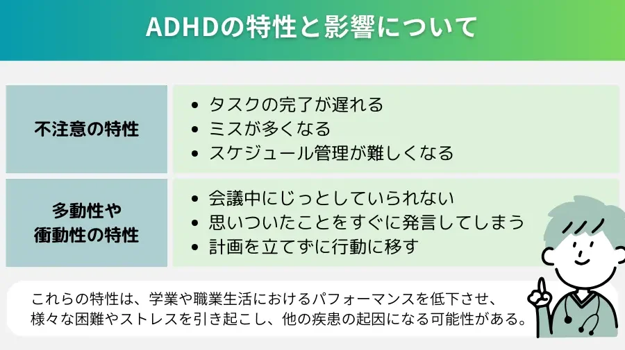 子供の場合、ADHDの症状は主に学業や友人関係に影響を与えます。具体的には以下のような傾向があります:
