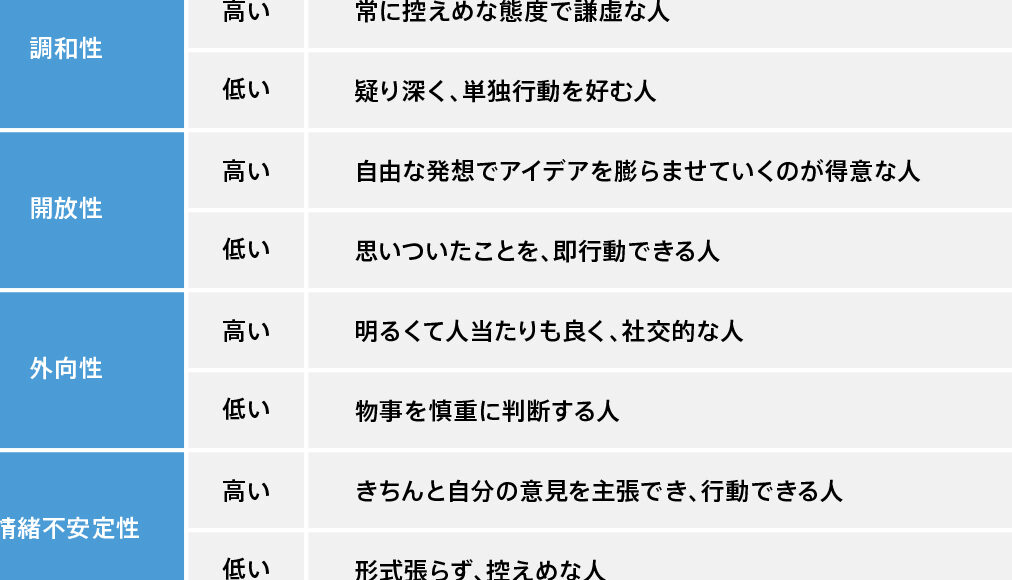 - 外向性: 社交的で活発な傾向。