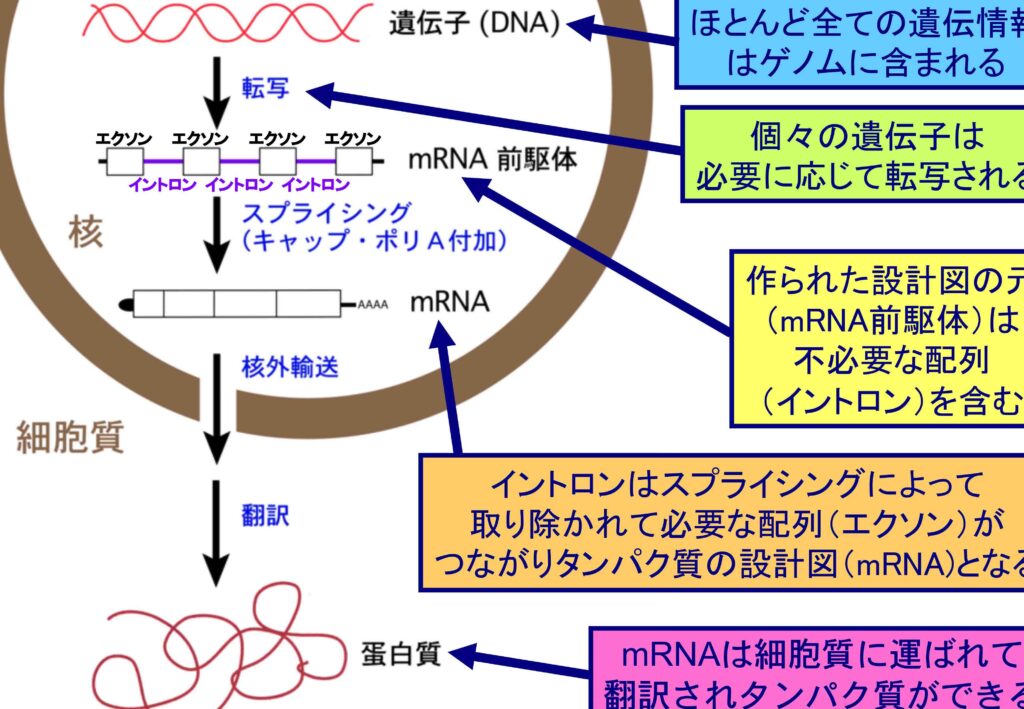 - 翻訳:mRNAからタンパク質への合成
