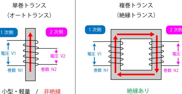 アイソレーショントランスは、二次側と一次側の間で直接的な接続がないタイプです。この構造によって得られる利点は以下です: