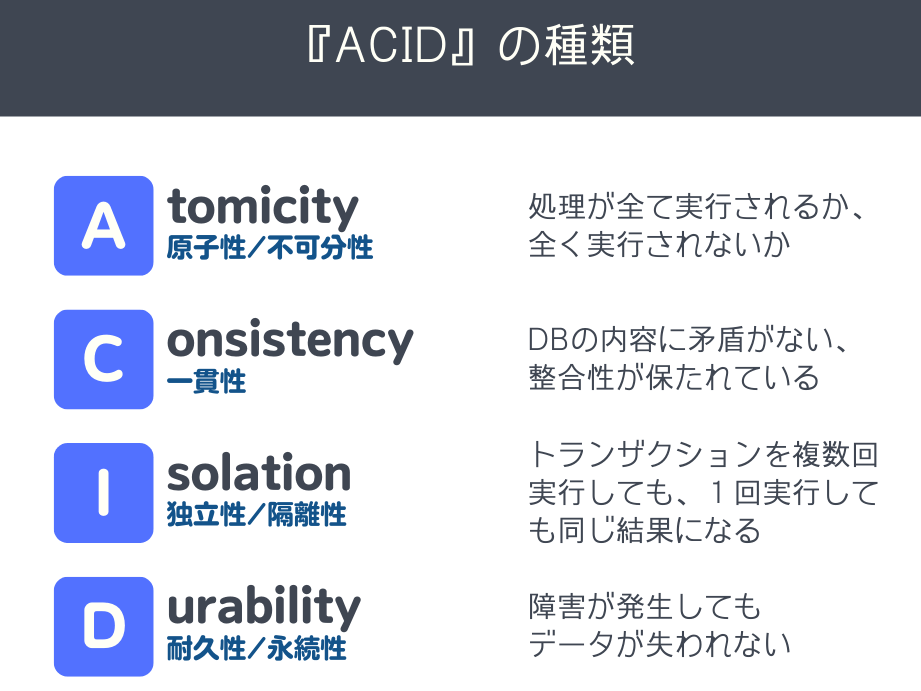 - 耐久性:成功したトランザクションによって行われた変更は永続的であり、システム障害などから復旧しても維持されます。