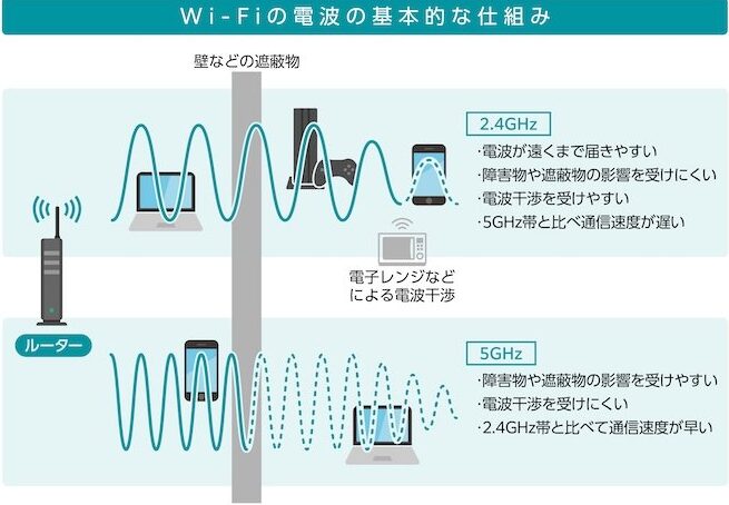 Wifiは主に2.4GHzと5GHzという二つの周波数帯域で動作します。それぞれの帯域には以下のような特性があります。