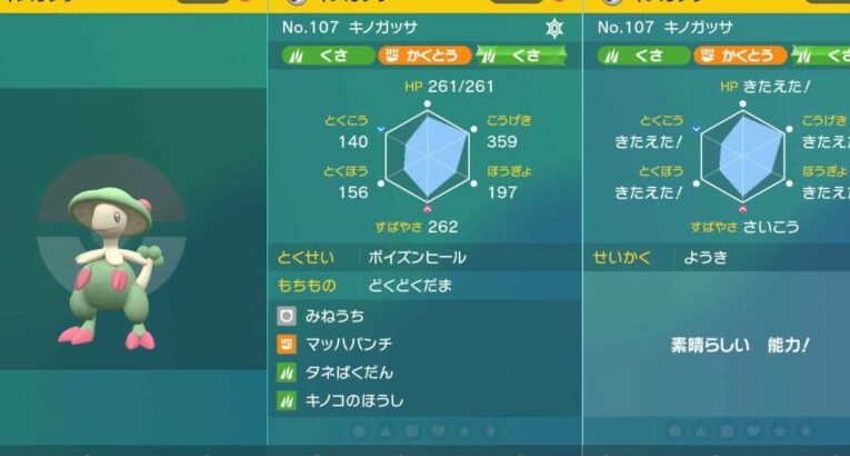 - 状態異常防止: キノココ自身や味方ポケモンへの状態異常を完全に無効化するため、相手の戦略を大きく制約します。