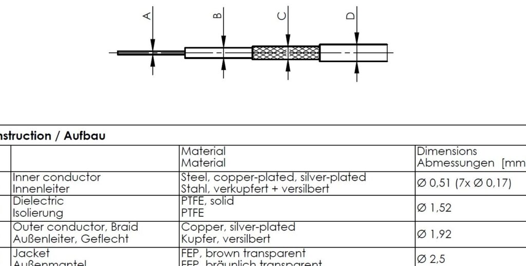次に絶縁体ですが、RG316ではポリテトラフルオロエチレン(PTFE)が使用されています。この材料は非常に耐熱性が高く、広範囲な温度条件下でも安定した性能を発揮します。さらに、この絶縁体は信号損失を最小限に抑える効果もあり、高周波数帯域での使用にも適しています。