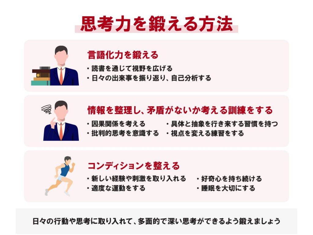 - 読書習慣: 定期的な読書は語彙力や理解度だけでなく、新しい視点やアイデアにも出会う機会となり、自身の思考範囲を広げます。