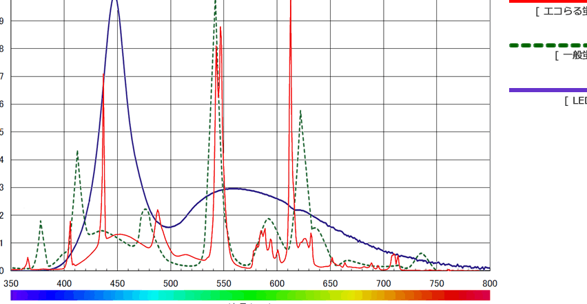 - 青色領域: 蛍光灯の多くは青い波長(約450nm)を強調しており、これは視覚的には鮮やかさを感じさせます。