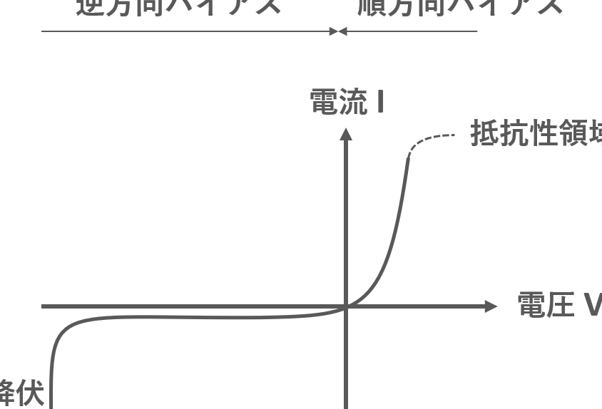 | ダイオード | I-V曲線は急激に上昇する部分(順方向)とほぼゼロとなる部分(逆方向)がある。 |